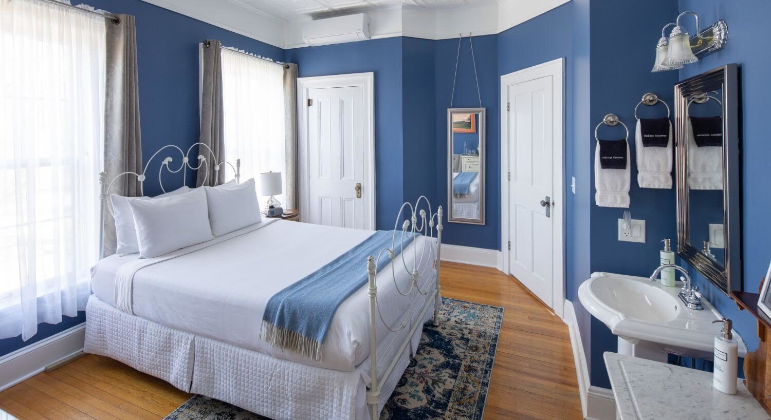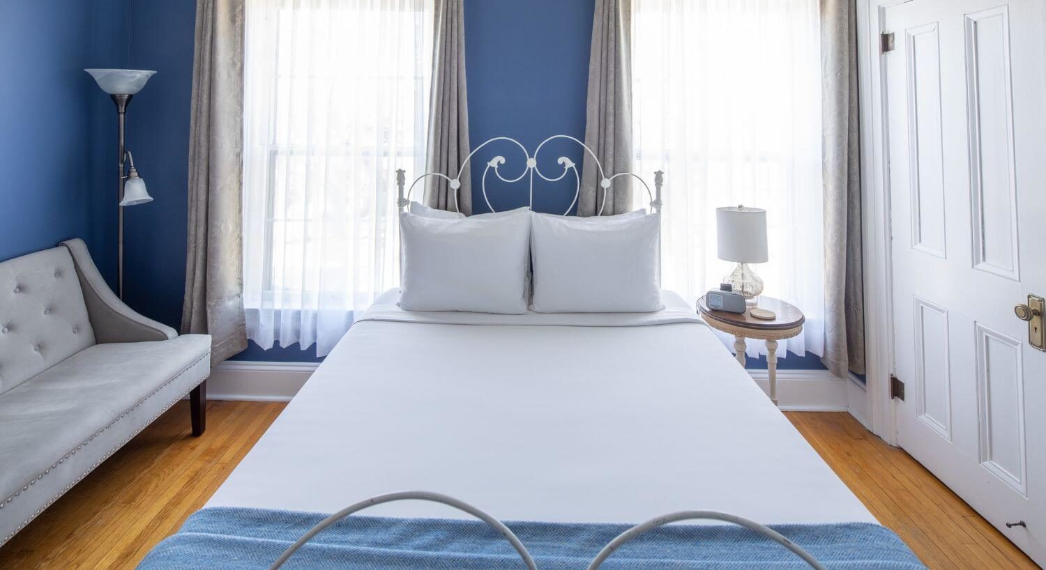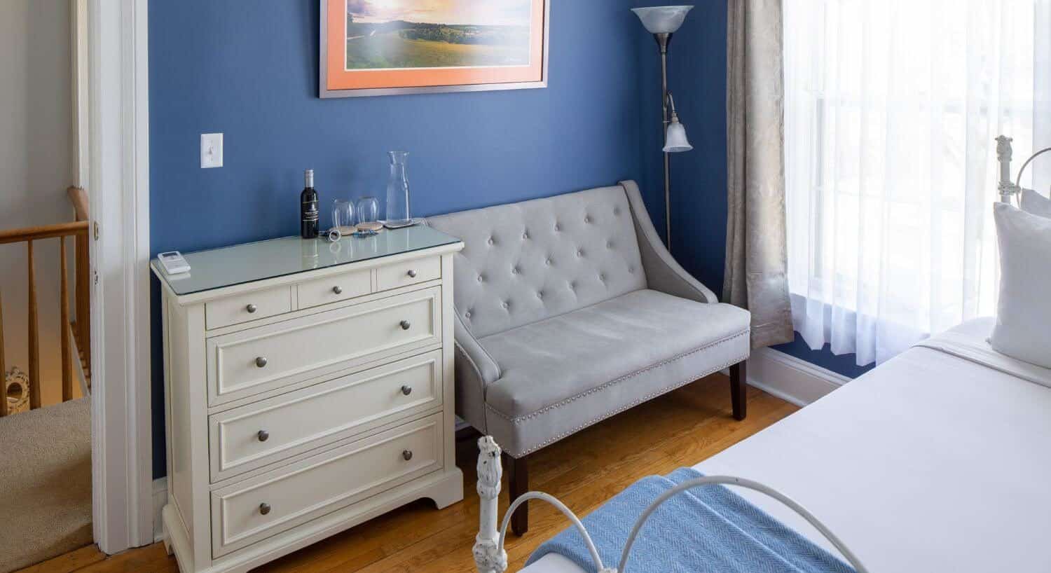 Located in the front of the house, Room 1 is one of our medium-sized accommodations.  It is flooded with light and is very airy. With a queen-size bed, a loveseat for two, individually controlled heat and A/C, and a private bathroom with a stand-up shower with sink in the bedroom portion, this room accommodates up to 2 persons.